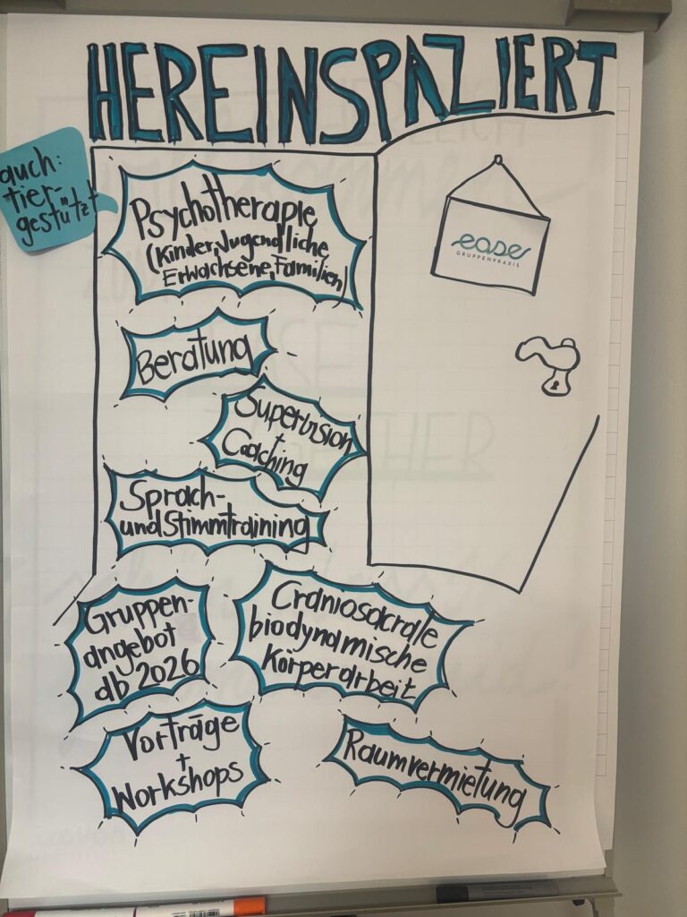 Das multiprofessionelle Team der Praxis stellte sich im Rahmen des Abends vor und gab einen umfassenden Einblick in sein breites Angebot: von Einzel-, Paar- und Gruppentherapie über Beratung, Supervision, Sprach- und Stimmtraining bis hin zu biodynamischer Körperarbeit und tiergestützter Therapie.